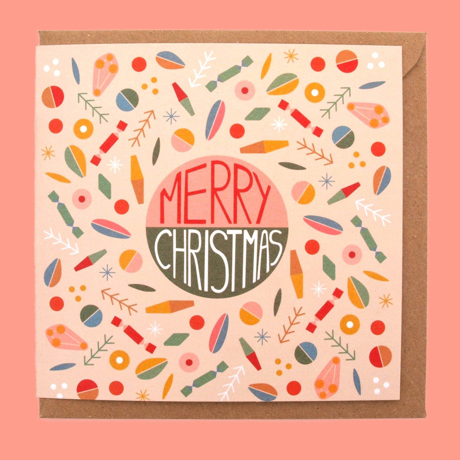 Christmas card with colorful patterns and 'Merry Christmas' text on a pink background