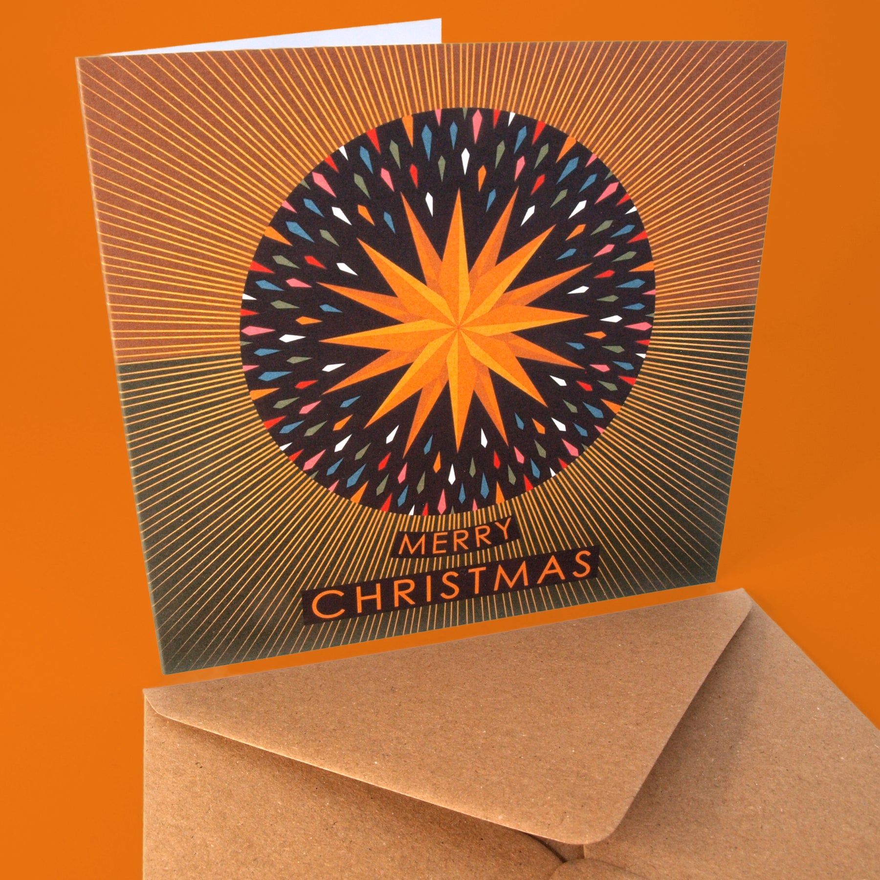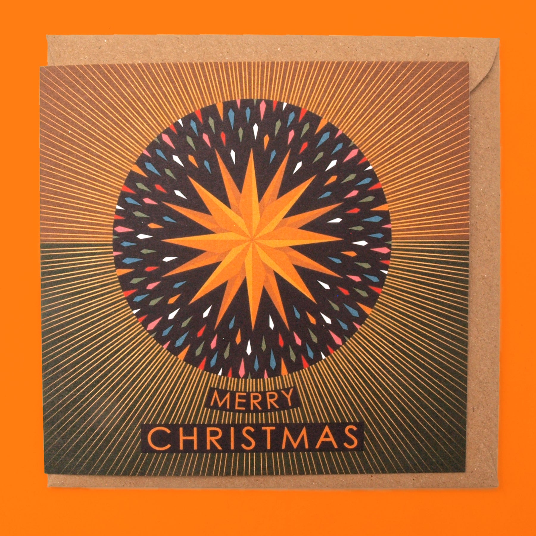 Christmas card with a colourful orange and yellow star design and 'Merry Christmas' text on an orange background