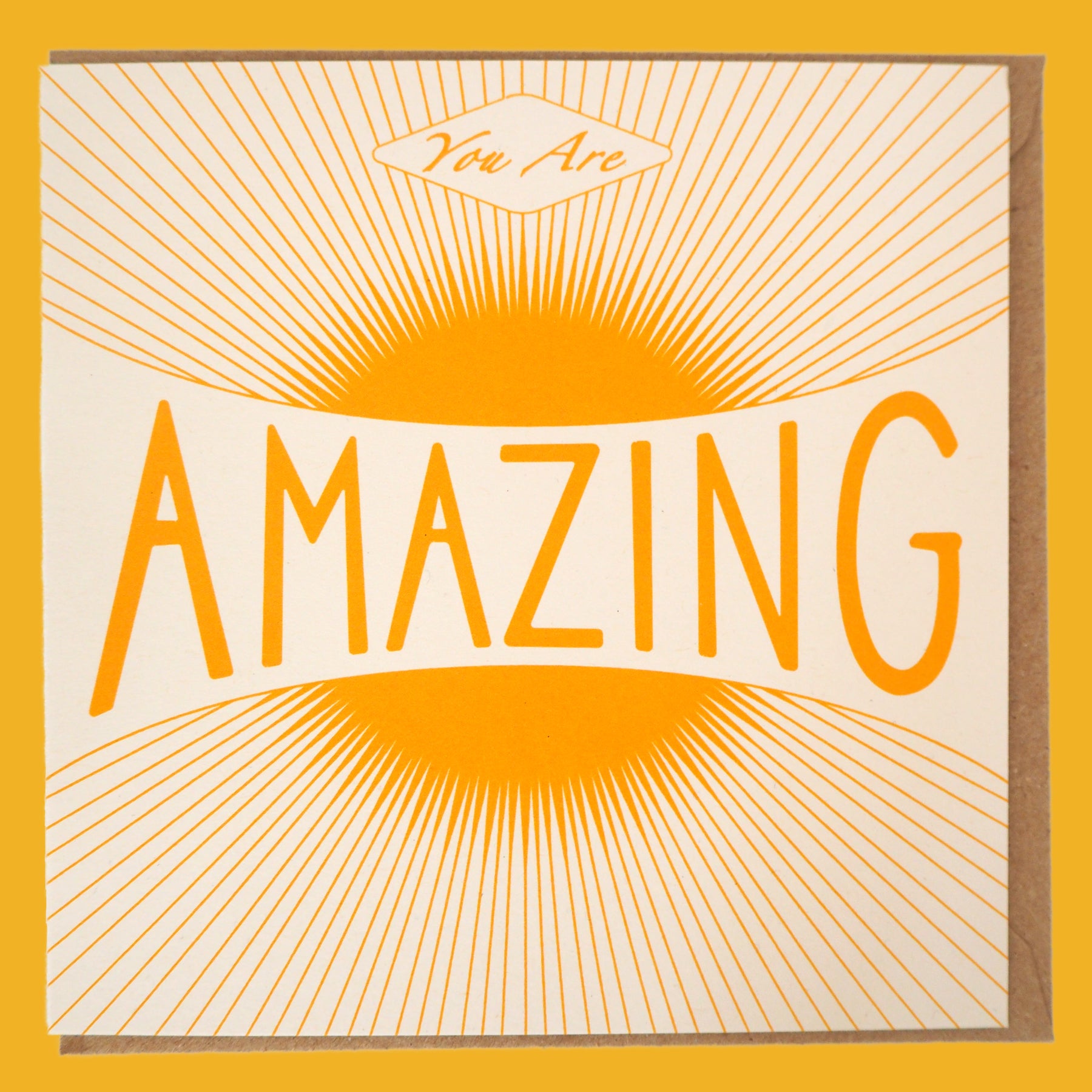 Design/Illustrations: A vintage style greeting card designs with the words 'You Are Amazing' written across a graphic illustration of a glowing sun.